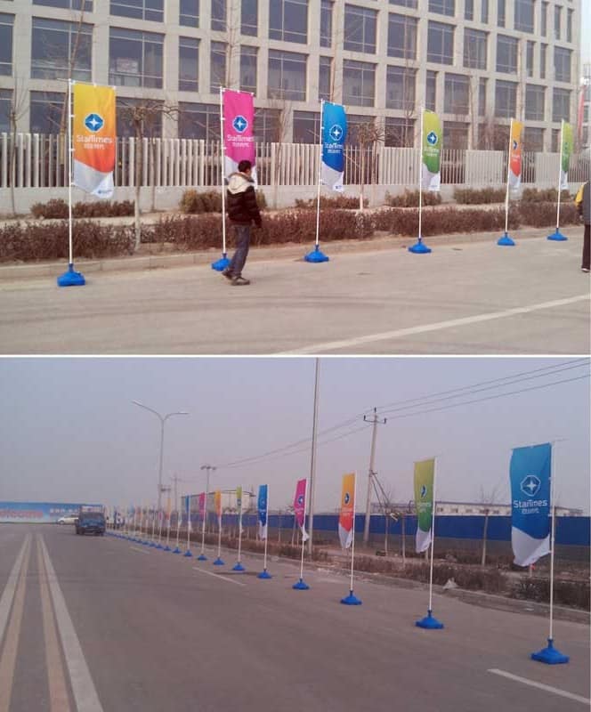 These 3m flagpole display stands are also similar to those 5-meter sets. Except the pole is thinner and the graphic size is smaller. The base is also a water-based concept.