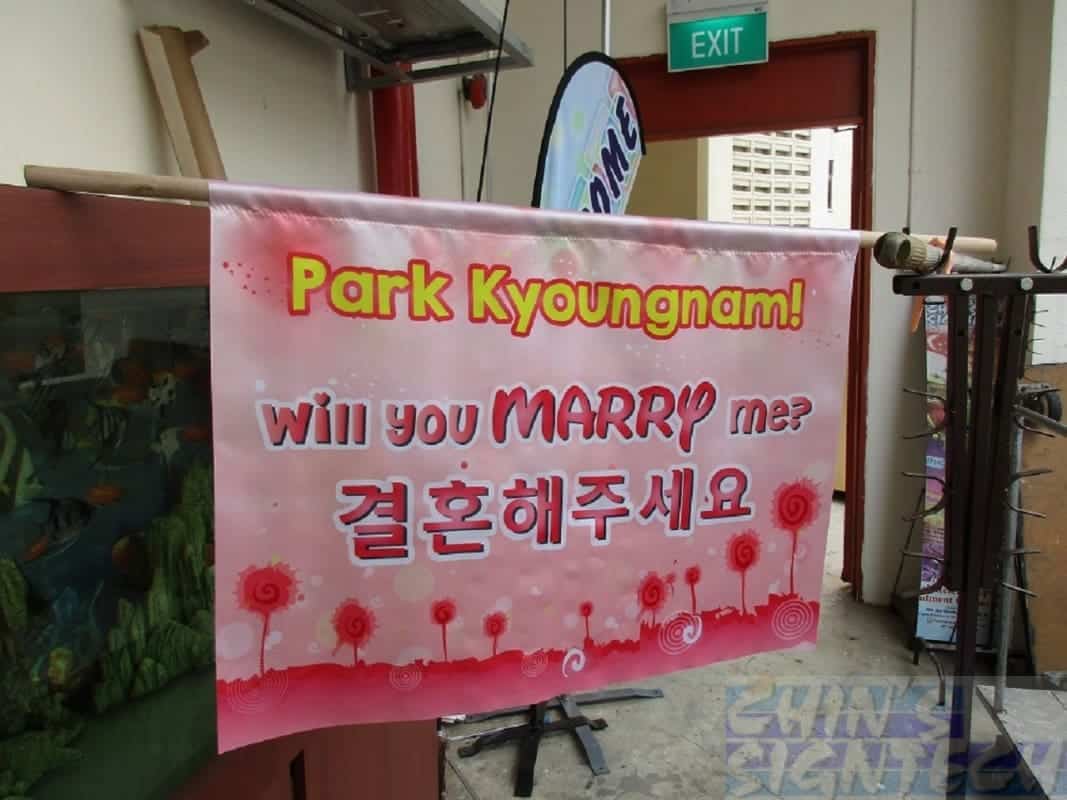Year 2015, China still popular using fabric as banners ! Did this for Huawei for their Introduction workshop. Hanging a cloth banner remind me year 2000+, we did cloth banners without any digital printer. Year 2016 coming soon, we going back to year 2000+ with cloth banners but with digital printing ! Hear comes the bride, angmoh also use satin.