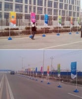 These 3m flagpole display stands are also similar to those 5-meter sets. Except the pole is thinner and the graphic size is smaller. The base is also a water-based concept.