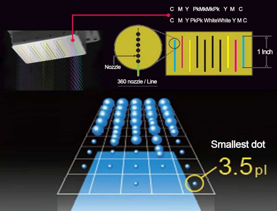 Industrial printheads, but, use larger droplets of 35 picoliters. They work faster but may not capture as much detail.
