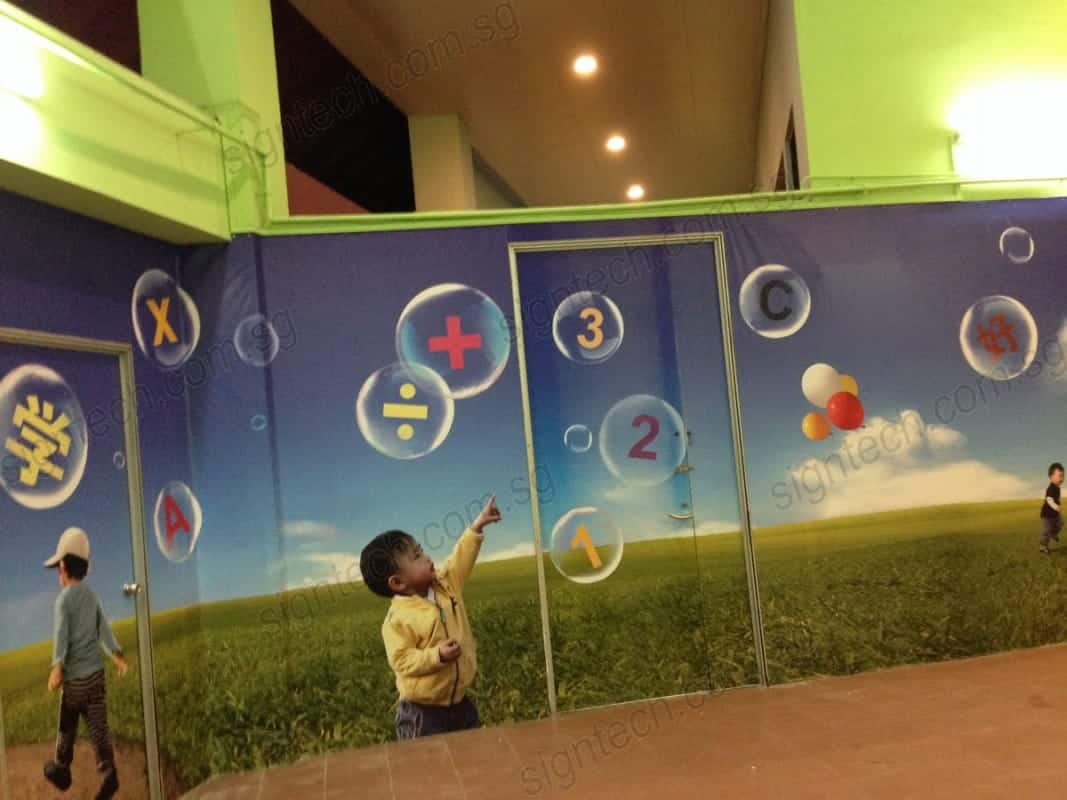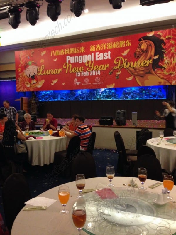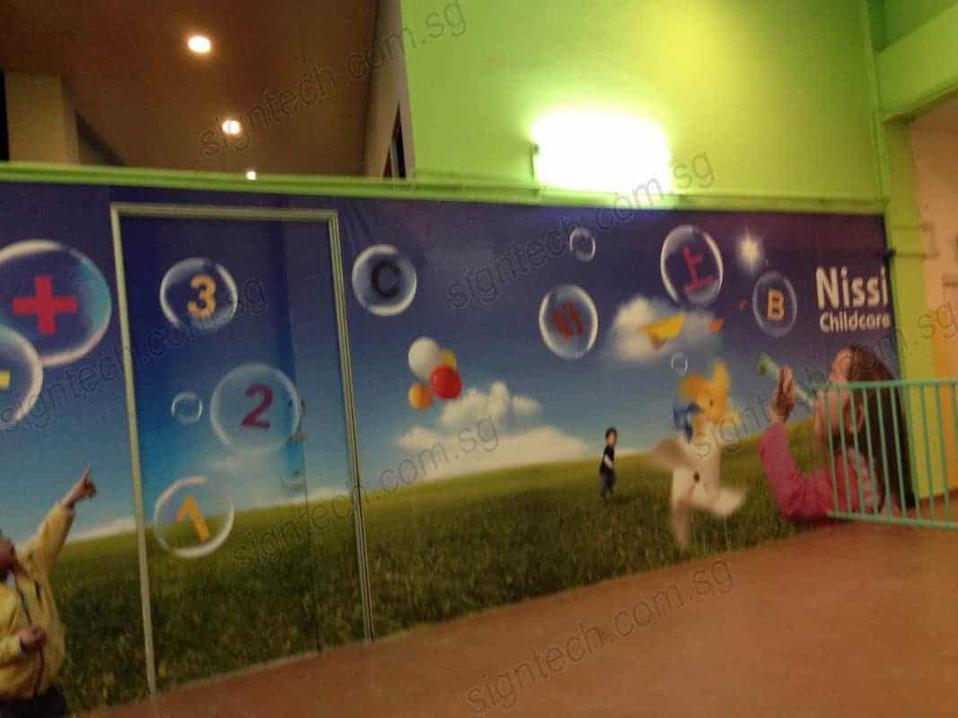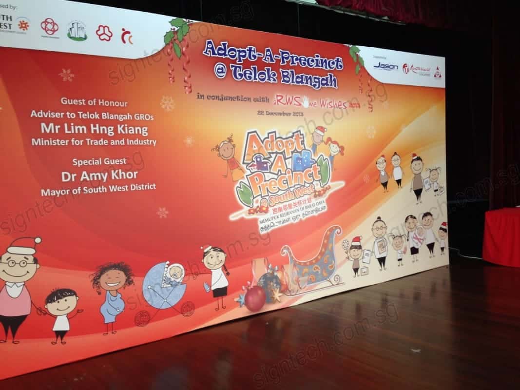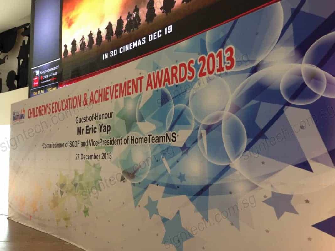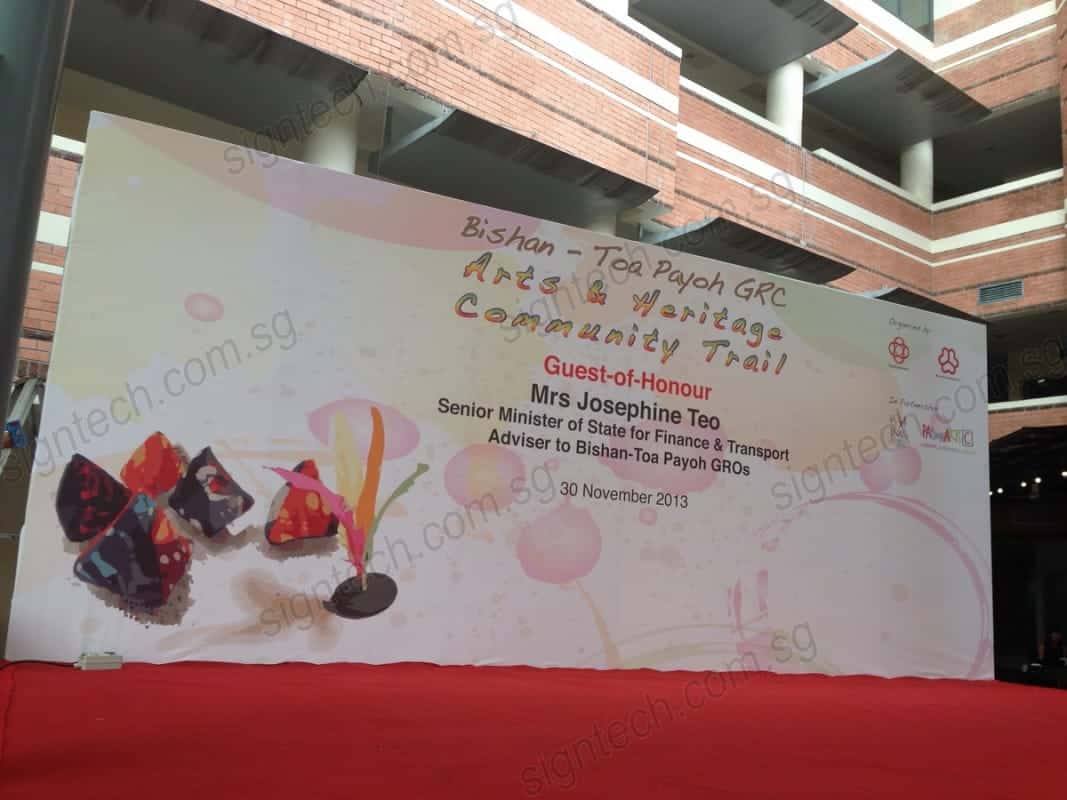 Printed on PVC banner on 3m large format printer mounted on wooden frame. Supported by metal stands behind.