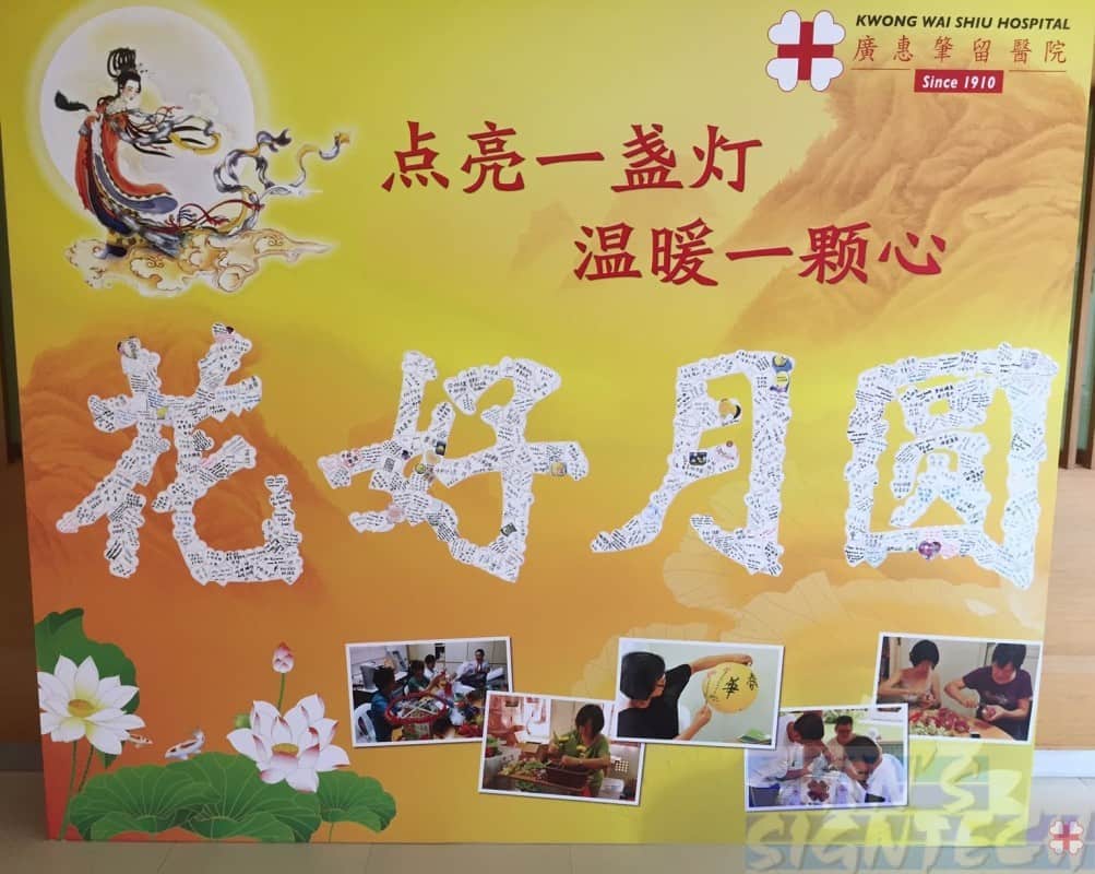 Design, print, setup this wedding chalk board photo booth 8 x 8 feet by us at Shangri La Rasa Sentosa. Another backdrop is for KWSH lantern festival. Those large empty Chinese texts are meant for pasting wishing stickers. Next is PSB photo booth 16 x 8ft with 3D walk through door entrance. Their main backdrop 20 x 8ft do too low, need at least 10ft height.